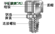 注脂嘴一般由蓋帽、鋼珠、彈簧和帶連接螺紋的本體幾部分組成,典型結構,如下頁圖2所示。從結構可見,注脂接頭一般采用底部壓邊結構將彈簧、鋼珠限制在注脂接頭本體內。