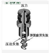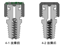 如下頁圖3所示,壓邊失效和彈簧疲勞失效是導致注脂接頭失效的重要原因。如下頁圖4-1所示是故障前注脂嘴結構;如圖4-2所示,則是注脂接頭內的止回球由于被污物(沙粒、金屬碎屑、固化脂等)卡住或彈簧失效而無法回復到原位,從而失去止回功能導致泄漏發生。此外還有止回球鋼珠破損等原因造成注脂嘴產生泄漏。