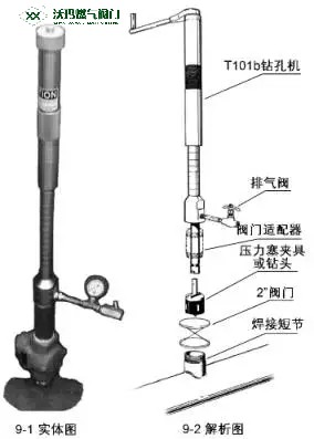 通過采用TDW公司的T101b鉆孔機及其附件,對失效注脂嘴進行在線帶壓拆卸和更換。T101b鉆孔機可實現密閉狀態下被夾持工件的螺旋式上升和下降(便于螺栓的擰緊和松開),亦可以實現內部夾持工件的垂直上升和下降 (便于注脂嘴螺栓擰緊到位后夾持器與工件脫開),T-101b帶壓更換工具(如圖9-1,9-2)。
